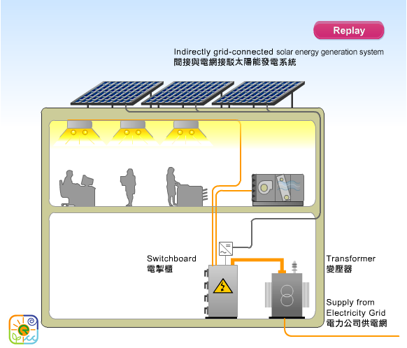 在 間 接 與 電 網 接 駁 的 情 況 下 , 可 再 生 能 源 發 電 系 統 的 輸 出 電 力 注 入 有 關 場 地 的 配 電 系 統 裡 。 電 網 與 可 再 生 能 源 發 電 系 統 同 時 為 場 地 提 供 電 力 。